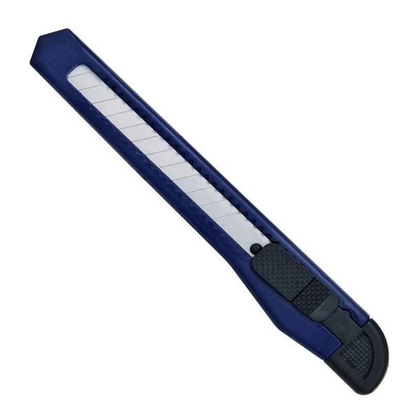 Estilete de corte manual, com lâmina de 9mm. Corpo plástico, com trava de segurança.